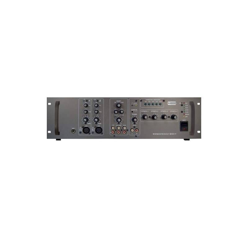 Wzmacniacz W-120U to trzystrefowy wzmacniacz miksujący wyposażone w trzy wejścia mikrofonowe oraz 2 wejścia liniowe