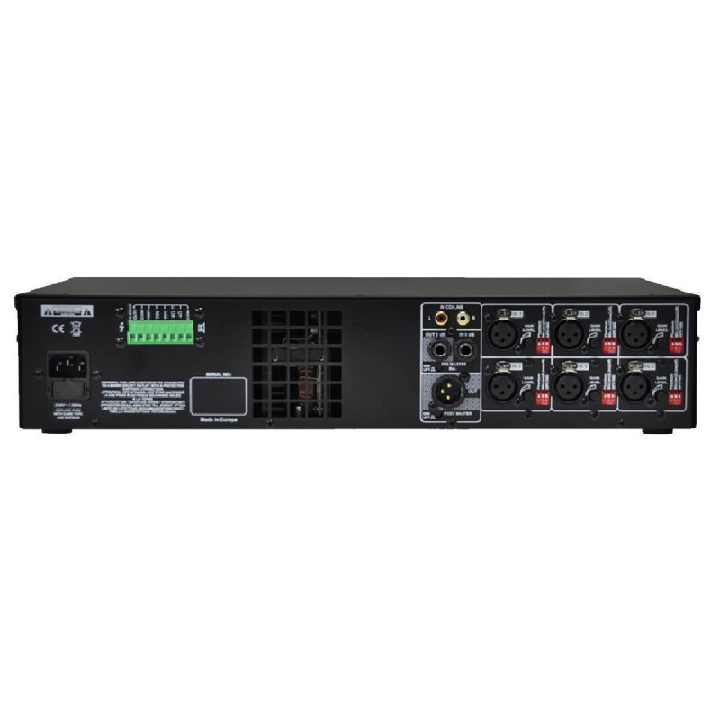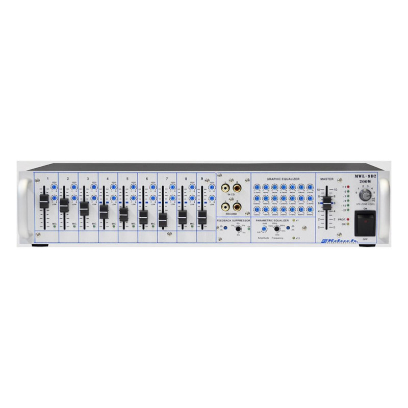 Wyposażenie wzmacniacza: osiem wejść mikrofonowych symetrycznych z regulacją wzmocnienia sopranów i basów oraz regulacją czułości wejścia; wejście uniwersalne Mag-CD z regulacją wzmocnienia, sopranów i basów; w każdym kanale mikrofonowym wyłączany filtr 100Hz, zasilanie Phantom oraz bramka szumów; 21-punktowy korektor graficzny; korektor parametryczny w całym paśmie akustycznym z regulacją od 0 ÷ -20dB; eliminator sprzężeń akustycznych; zabezpieczenia końcówki mocy: temperaturowe, przeciwzwarciowe, prądowe, przeciw w.cz., limiter;