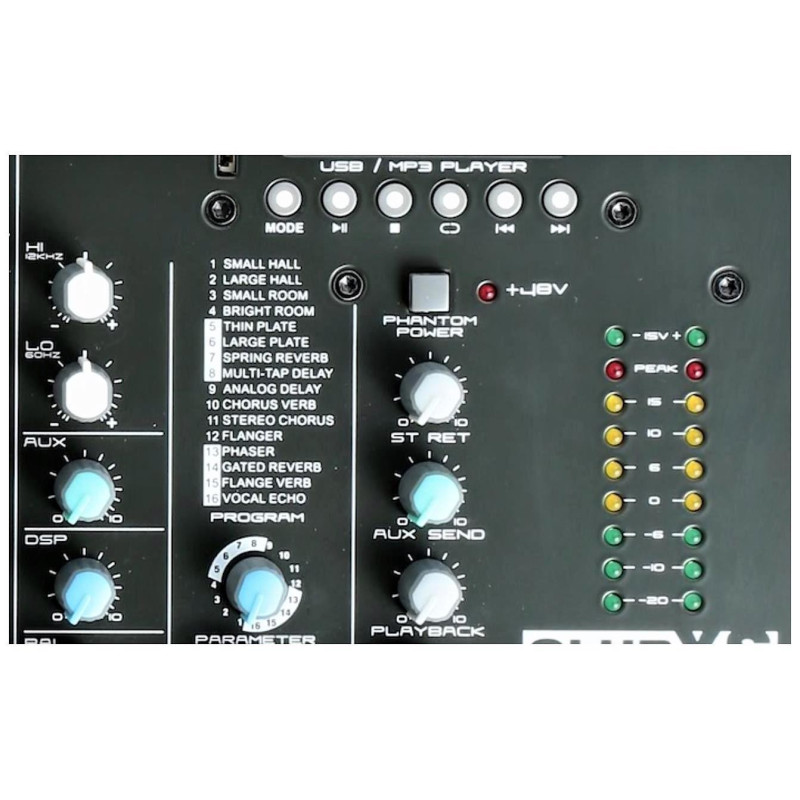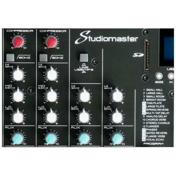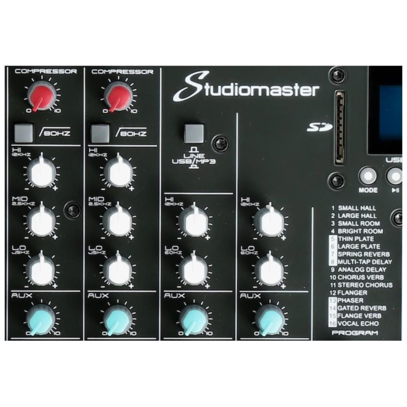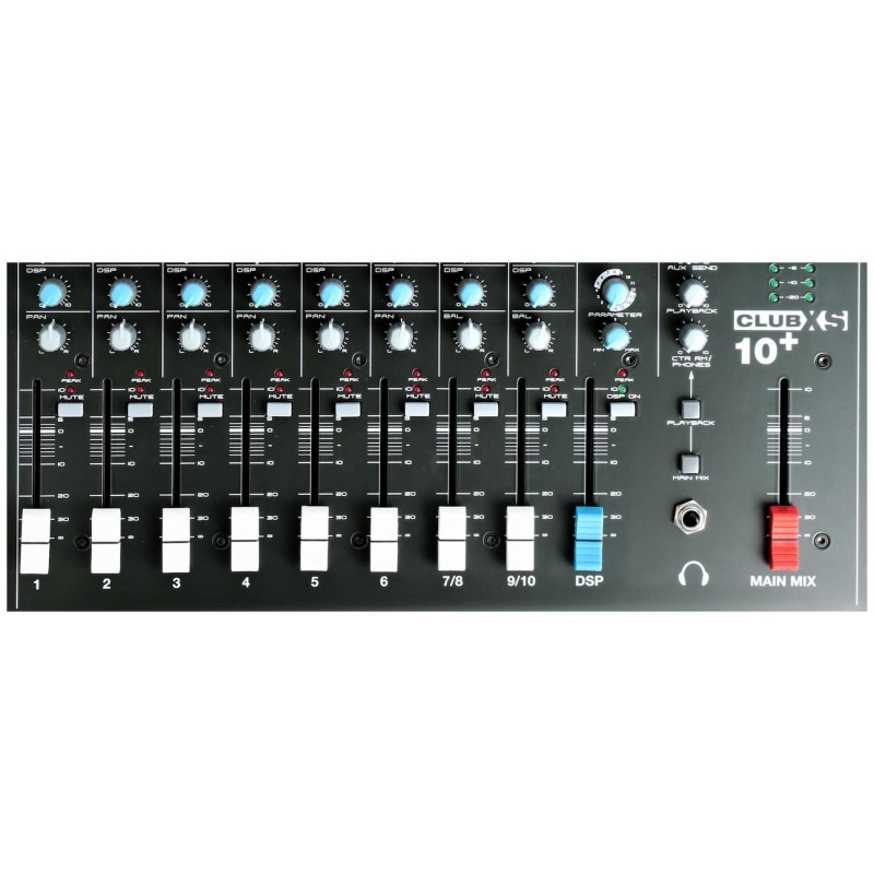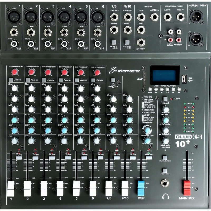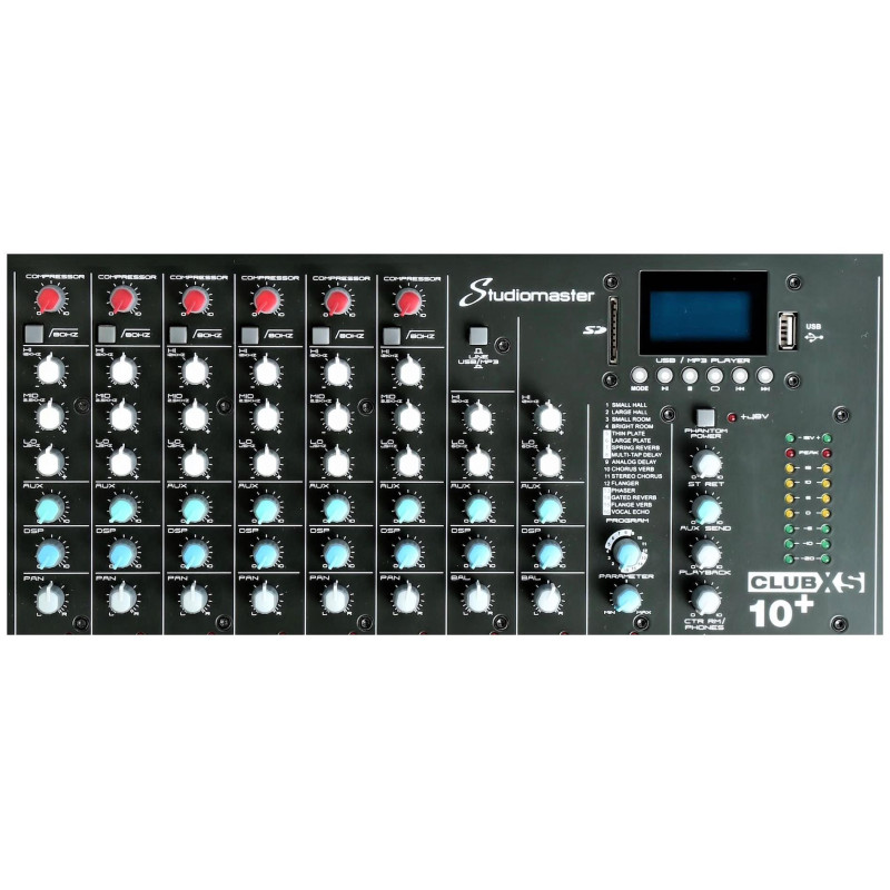 Studiomaster CLUB XS 12+ wyposażono w 8 torów mikrofonowych, 2 tory stereofoniczne, procesor efektów, odtwarzacz plików MP3 z kart SD lub pendrive, rejestrator, odbiornik bluetooth. Nowa wersja posiada dodatkowo gniazdo do podłączenia pedału załączania wewnętrznego procesora efektów DSP.