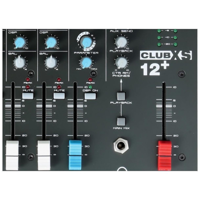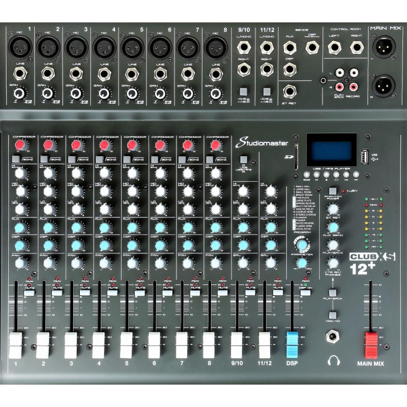 Studiomaster CLUB XS 12+ wyposażono w 8 torów mikrofonowych, 2 tory stereofoniczne, procesor efektów, odtwarzacz plików MP3 z kart SD lub pendrive, rejestrator, odbiornik bluetooth. Nowa wersja posiada dodatkowo gniazdo do podłączenia pedału załączania wewnętrznego procesora efektów DSP.