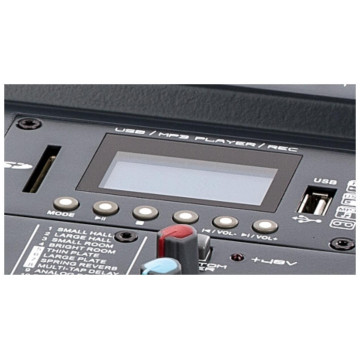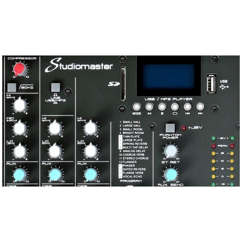 Studiomaster CLUB XS 8 posiada 4 tory mikrofonowe wyposażone w kompresory, procesor efektów, odtwarzacz plików MP3 z kart SD lub pendrive, rejestrator, odbiornik bluetooth.